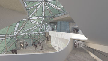 The project’s form is driven by the common conception of algae as a dirty, unwanted waste product. This concept is mirrored in the algae farm by a triangulating, tesselated “virus” that latches unto the building and ruptures its facade on each face. Interior walls deform to accommodate this disruption, and the internal organization is driven by the centrality of the CO2 capture tank and a circulatory apparatus that connects diagonally and across the building to connect to different points of interest within the building.