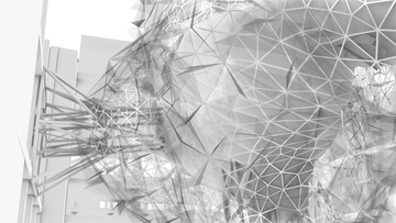 Conjunctive Amorphoid is located within the atrium and outdoor courtyard of the Fairtrade Palace in Prague, Czech Republic - an art museum that houses historical works. The building is fairly outwardly-focused, as visitors can expect to spend almost all of their time along the “outer ring” of the building, traversing exhibits. Meanwhile, the existing courtyard/atrium is a bleak space, rarely open to the public. This is remedied by occasional installations by various local artists. Our design brief called for one such installation.